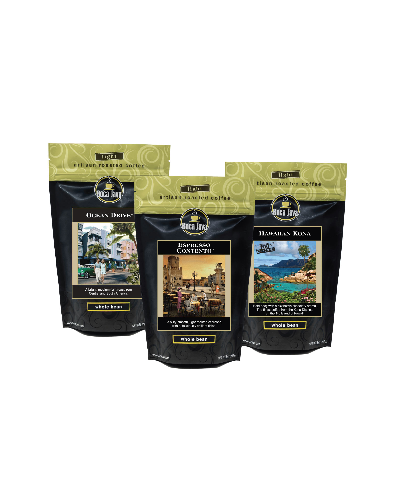 The Light roast 3-Pack includes Boca Java's most popular light roast coffees. The set includes one 8oz bag of each of the following: Ocean Drive, Espresso Contento and Hawaiian Kona Extra Fancy Coffee.